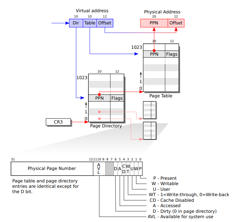 ->Page Directory contains 1024 PTEs, each points to page table that contains other 1024 PTEs: 2^10^10, total 2^20 PTEs can be used.