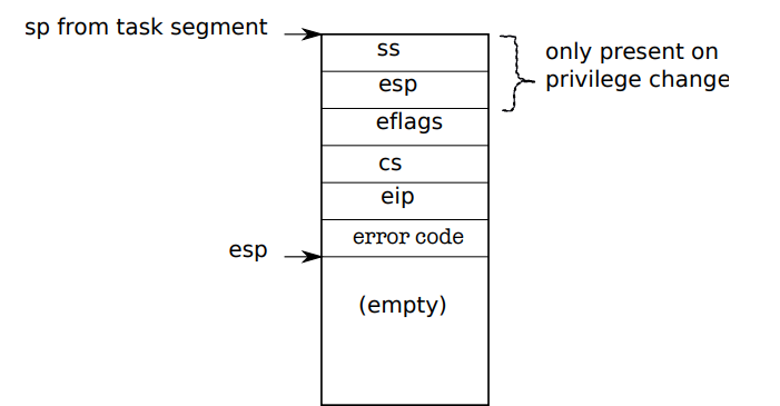 If the processor was executing in user mode, it loads %esp and %ss from the task segment descriptor, pushes the old user %ss and %esp onto the new stack.