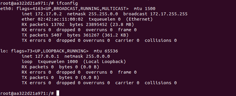 컨테이너 안에서 ifconfig 명령어로 컨테이너의 네트워크 인터페이스 확인!