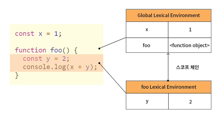 - 렉시컬 환경은 식별자와 식별자에 바인딩된 값, 그리고 상위 스코프에 대한 참조를 기록하는 자료구조로 실행 컨텍스트를 구성하는 컴포넌트다