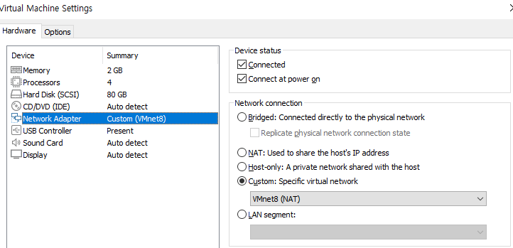 VMware의 가상머신 설정에서 네트워크 카드의 커넥션을 VMnet8에 맞춰준다.