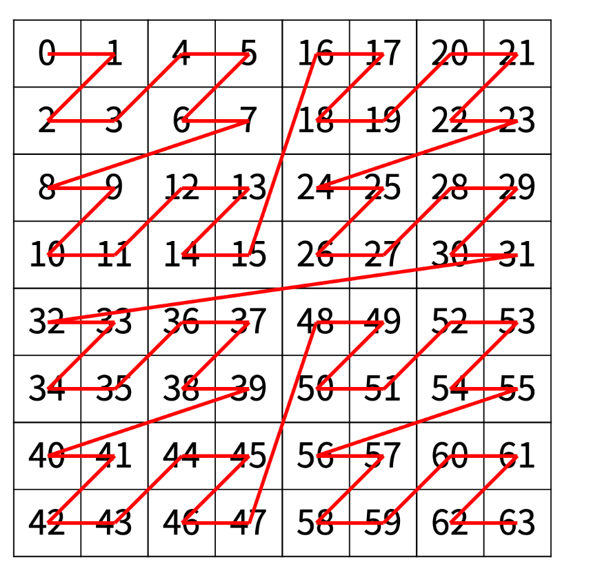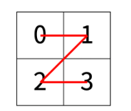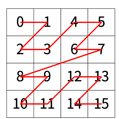 다음 예는 2^2 × 2^2 크기의 배열을 방문한 순서이다.