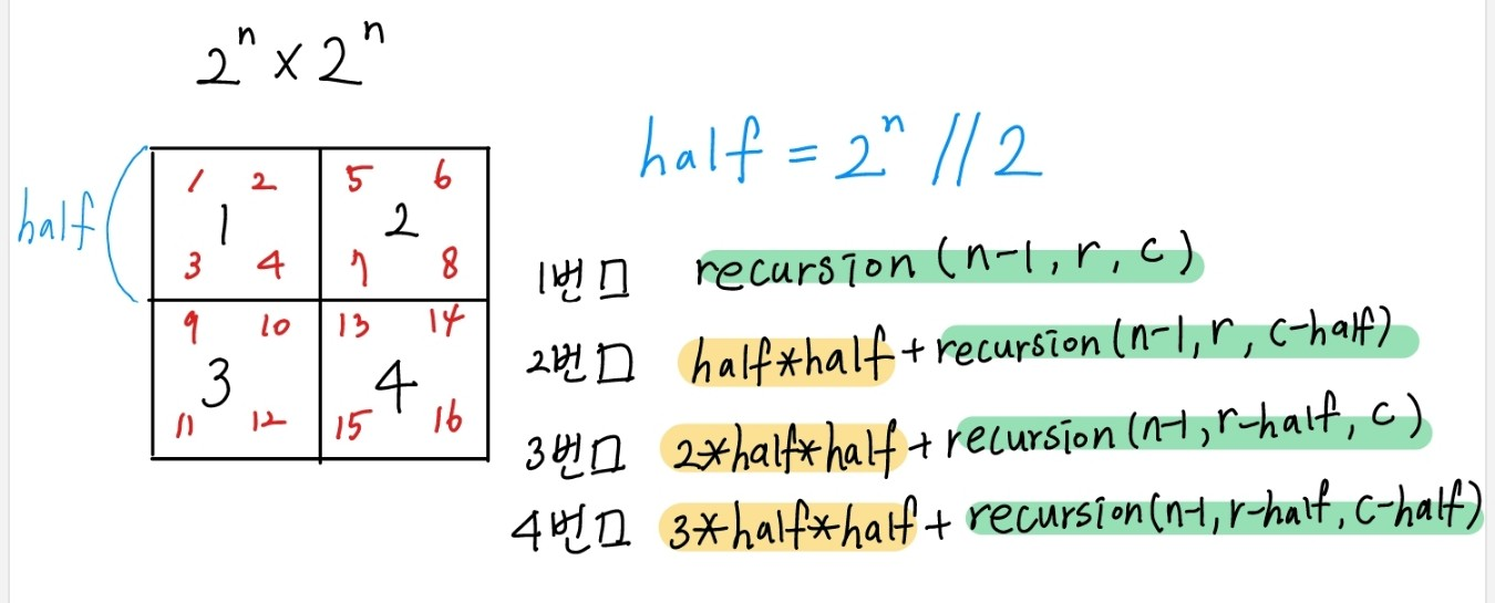 def recursion(n, r, c): # 2^n * 2^n에서 (r,c)를 방문하는 순서를 반환하는 함수