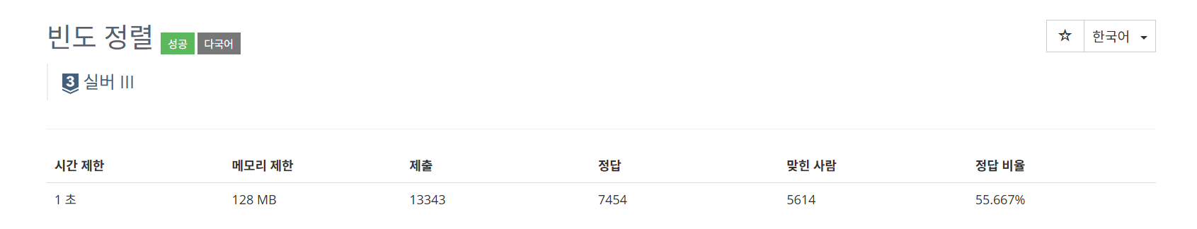처음에 몇 번 나왔는지 세기 위해서 딕셔너리를 쓸까 생각했다가 등장 횟수가 같을 때 정렬하기가 효율적이지 않을 것 같아서 리스트로 방향을 틀었다.