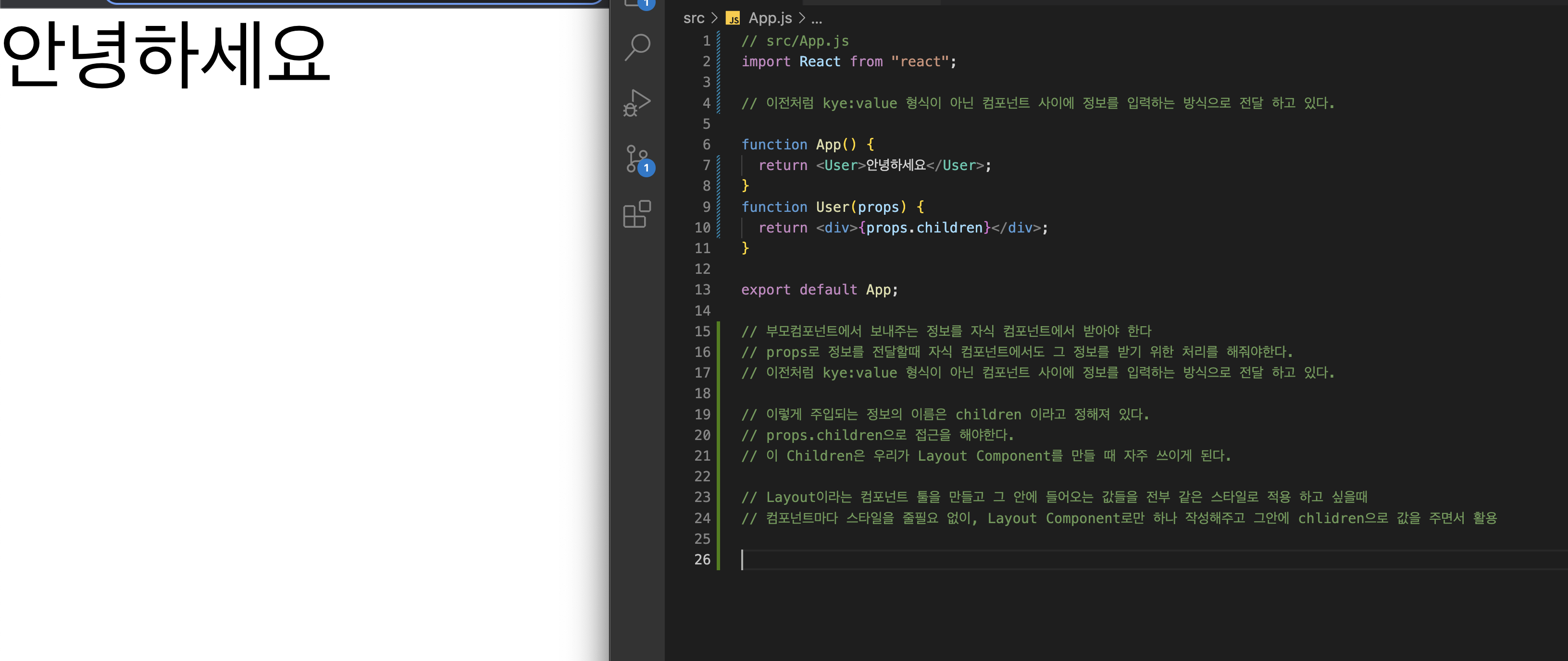그런데 위 예시에서는 User 안녕하세요 User 이렇게 정보를 보내고 있습니다. User hello='안녕하세요' 이렇게 props를 보내던 방식과는 조금 다릅니다. 이것이 children props를 보내는 방식입니다. 그렇다면 자식 컴포넌트에서는 어떻게 정보를 받을까요? 정보를 받는 방식은 기존과 동일합니다. 대신 그 이름이 children 으로 정해져 있습니다.
