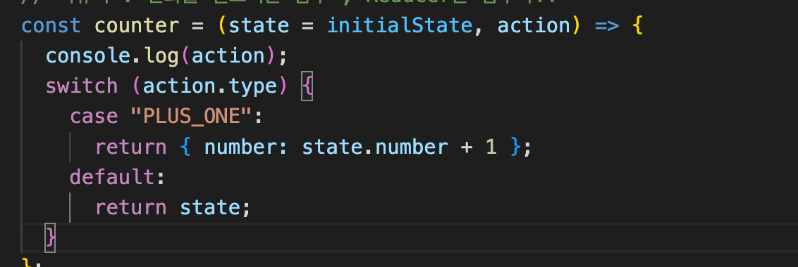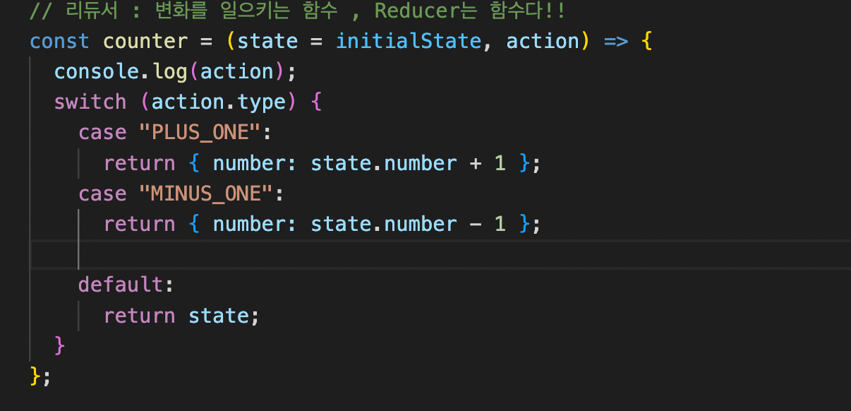 값의 수정은 reducer (변화를 일으키는)함수에서 일어난다. => 그럼 우리가 만약에 counter.js 모듈에 있는 number에 +1을 하고 싶으면 => 리듀서에게 보낼 number를 +1 하라는 “명령”을 만든다.=> 명령을 보낸다 => 리듀서에서 명령을 받아 number +1을 한다.