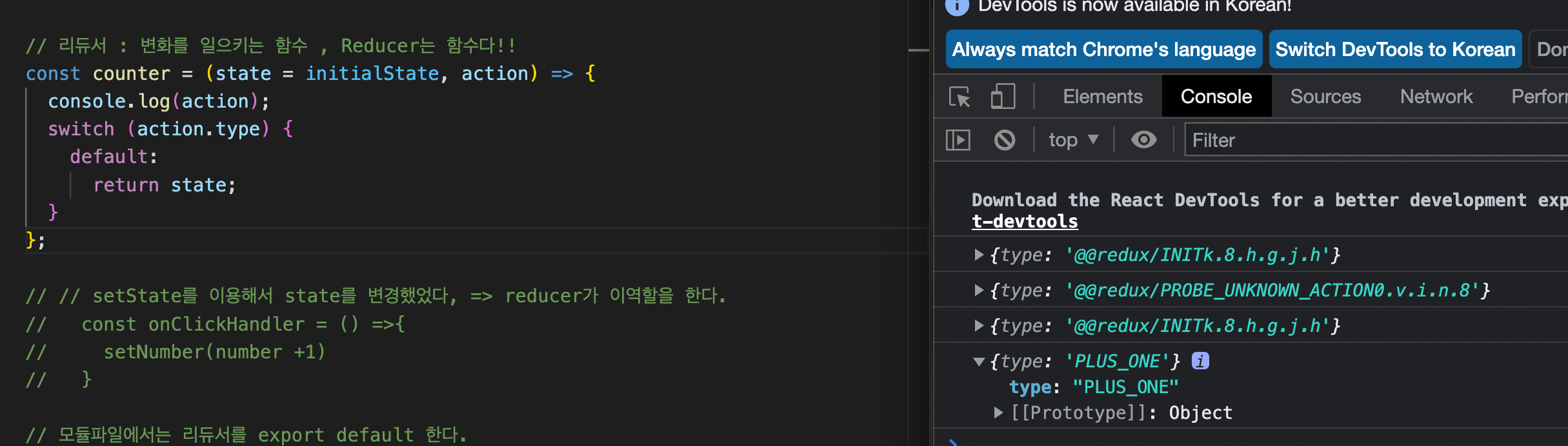 => 내가 어떤 action을 하길 원한다는 것을 reudcer에게 표현을 하면 reducer가 실행한다. => 이행동을 code로 나타내면 객체,