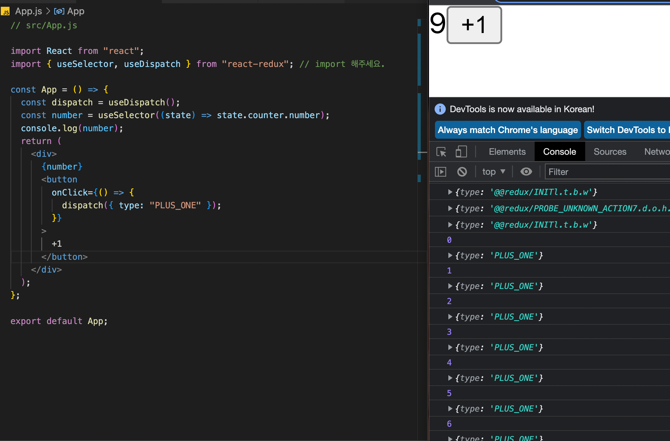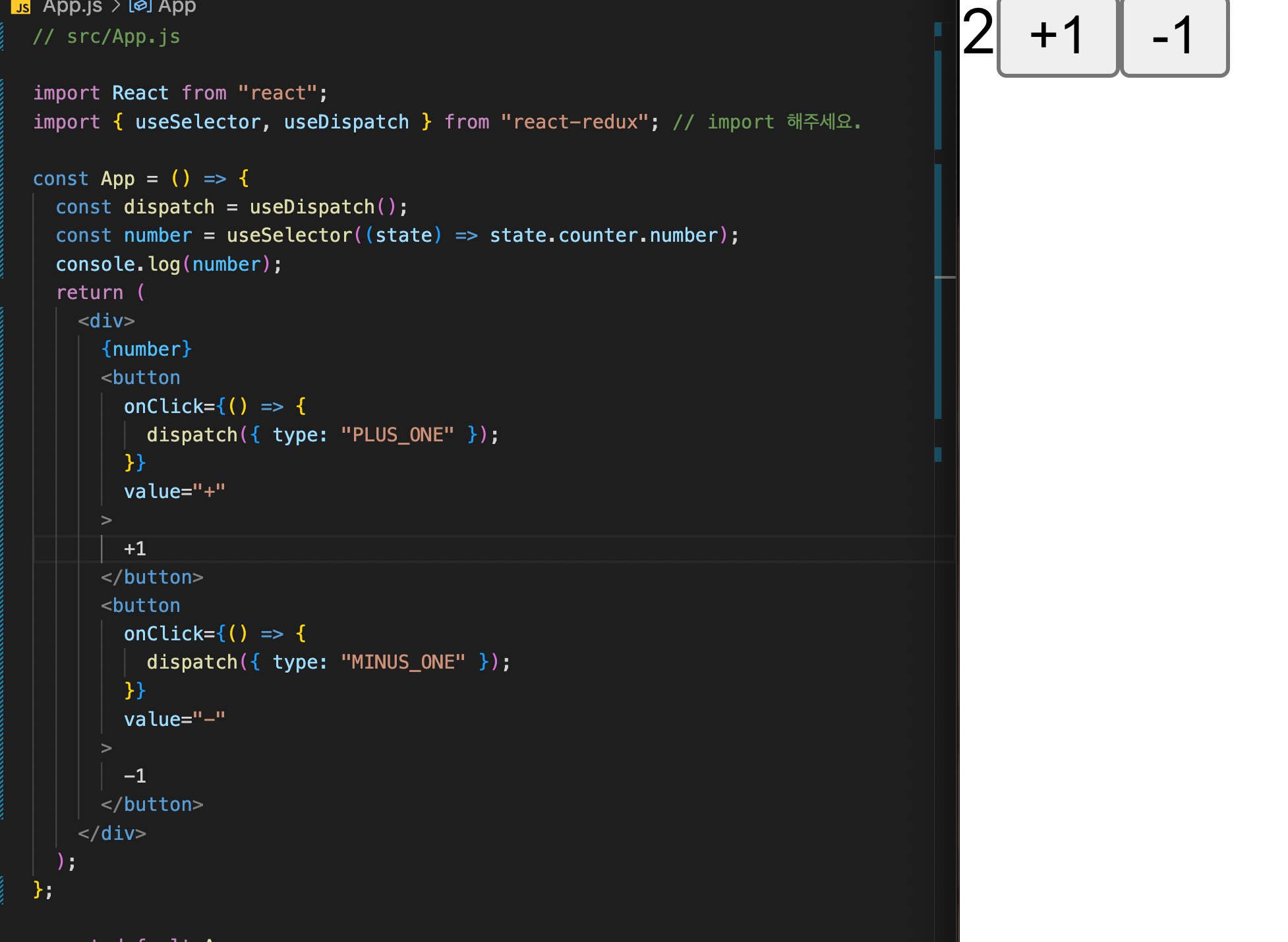 const dispatch = useDisaptch() 이런식으로 사용하면 함수이다. => 괄호 안에 action객체를 넣어준다.
