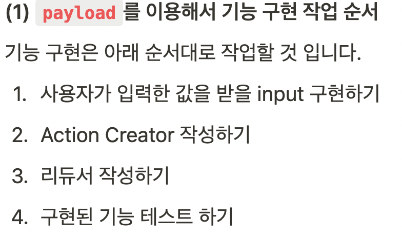 카운터 프로그램을 사용하는 사용자가 직접 더하고 뺄 숫자를 정할 수 있게 하려한다 => 이제 “N을 더해” 라고 N을 같이 리듀서에서 보내야 한다. 지금까지는 ~을 이라는 목적어가 없었다면, 이제는 그 목적어가 생긴것이고 목적어도 액션객체에 담아 같이 보내줌 = Payload