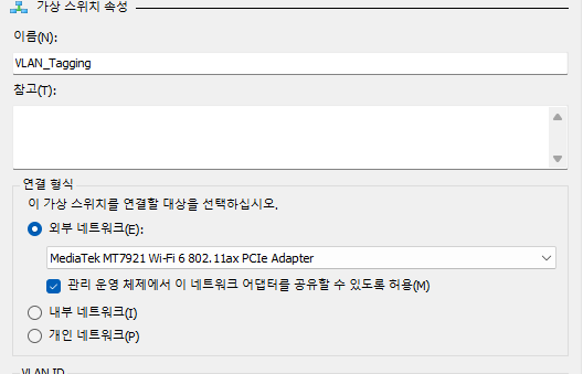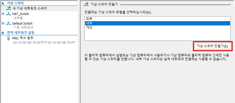 새 가상 네트워크 스위치 -> 내부 -> 가상 스위치 만들기