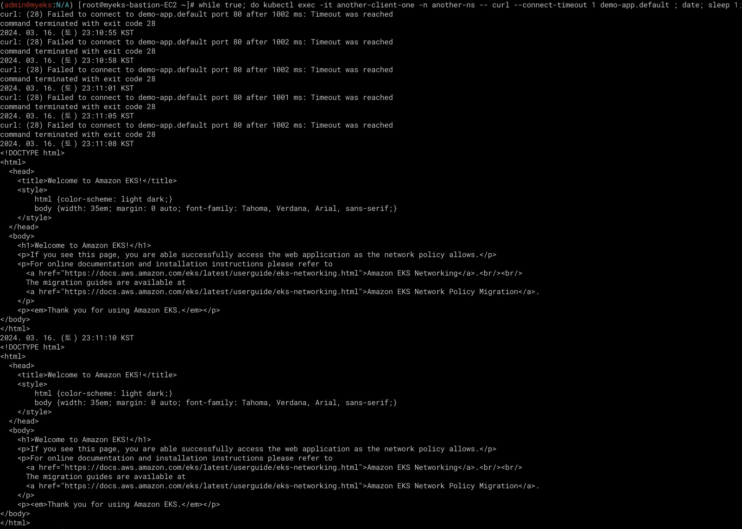 while true; do kubectl exec -it another-client-one -n another-ns -- curl --connect-timeout 1 demo-app.default ; date; sleep 1; done