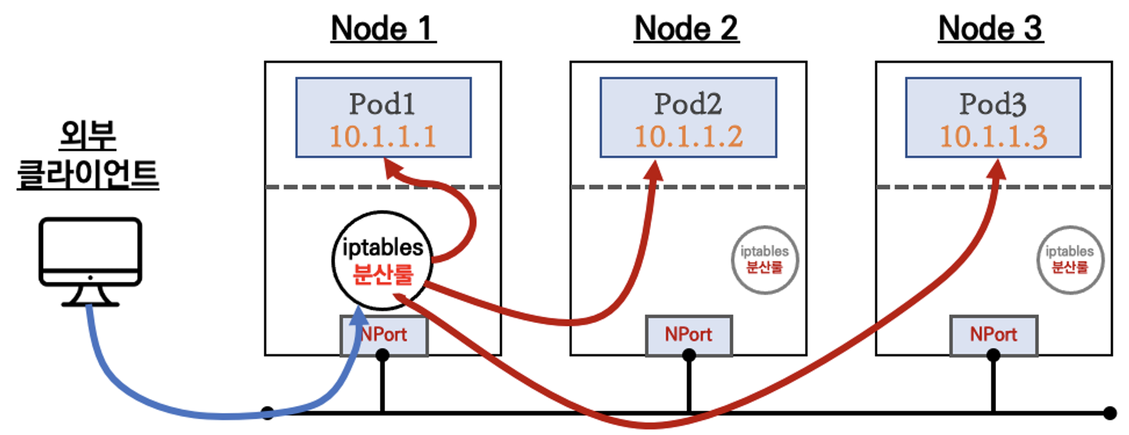 외부 클라이언트가 '노드IP:NodePort' 접속 시 해당 노드의 iptables 룰에 의해서 SNAT/DNAT 되어 목적지 파드와 통신 후 리턴 트래픽은 최초 인입 노드를 경유해서 외부로 되돌아감