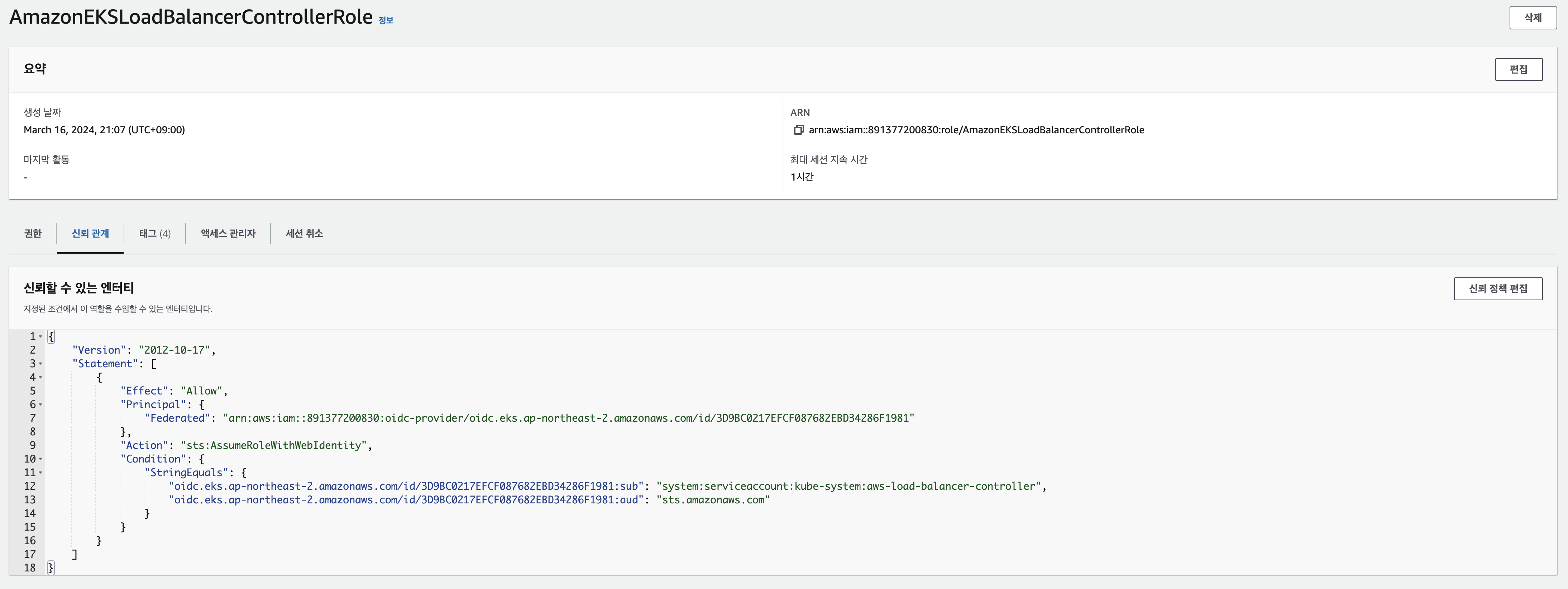 # IAM 역할 생성. AWS Load Balancer Controller의 kube-system 네임스페이스에 aws-load-balancer-controller라는 Kubernetes 서비스 계정을 생성하고 IAM 역할의 이름으로 Kubernetes 서비스 계정에 주석을 답니다