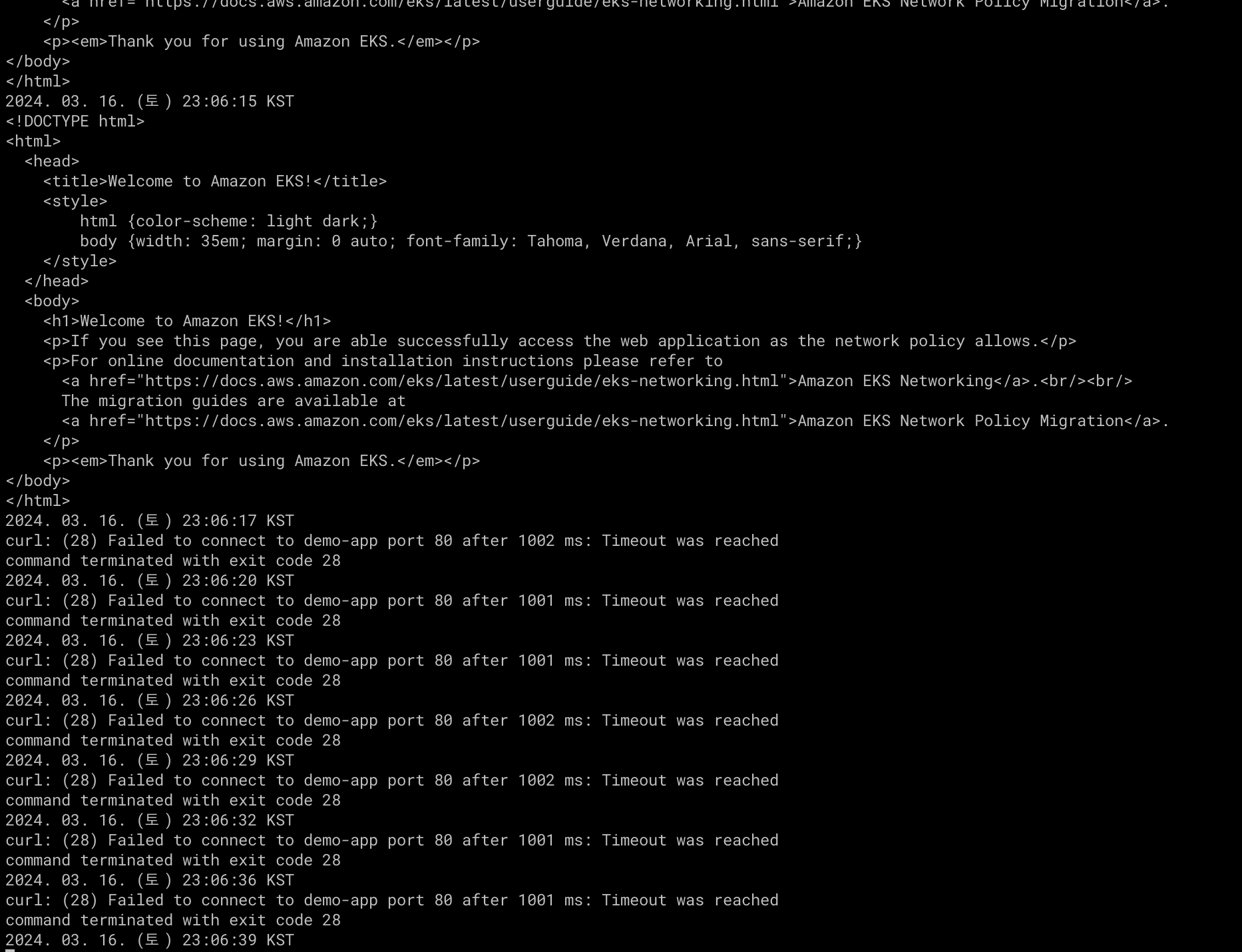 curl: (28) Failed to connect to demo-app port 80 after 1001 ms: Timeout was reached