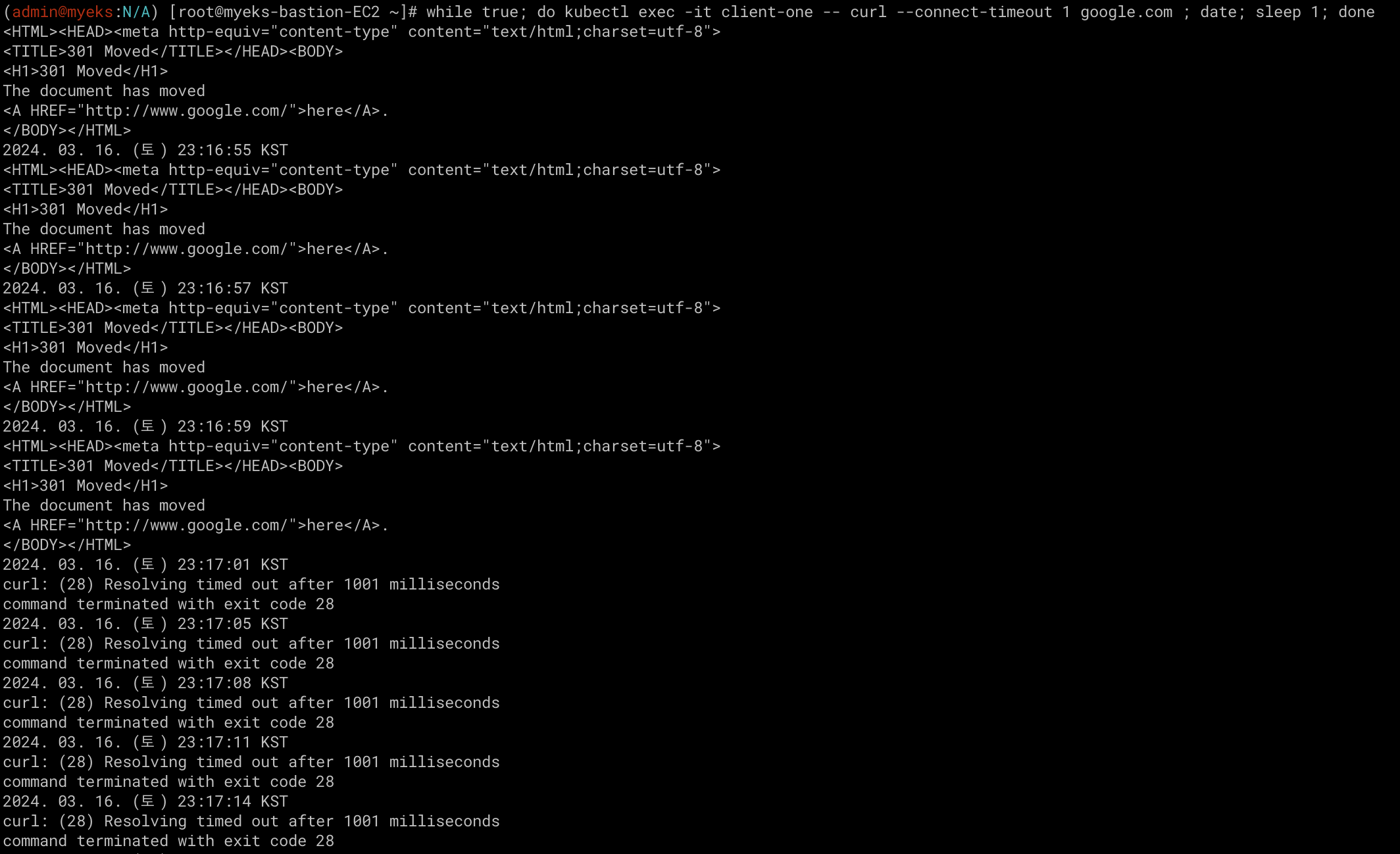 while true; do kubectl exec -it client-one -- curl --connect-timeout 1 google.com ; date; sleep 1; done