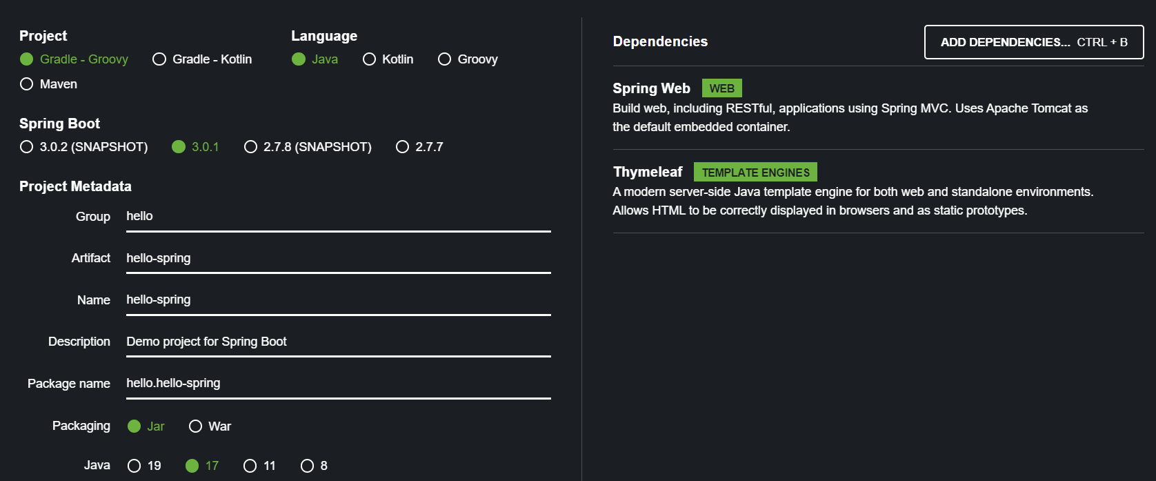 (Dependencies에서 Thymeleaf는 html을 만들어주는 라이브러리)