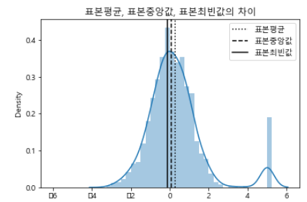 - 대칭분포를 비대칭으로 만드는 데이터가 더해지면 표본평균이 가장 크게 영향을 받고 표본최빈값이 가장 적게 영향을 받음.