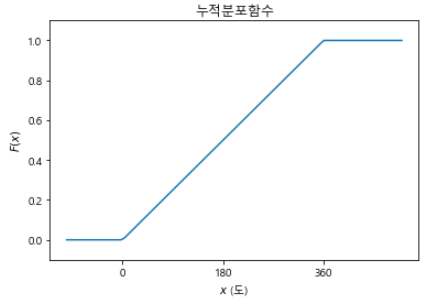 - 누적분포함수 : 표본 수가 무한하고 모든 표본에 대해 표본 하나만을 가진 사건의 확률이 동일하다면, 표본 하나에 대한 사건의 확률은 언제나 0 (주어진 확률 변수가 특정 값보다 작거나 같은 확률)