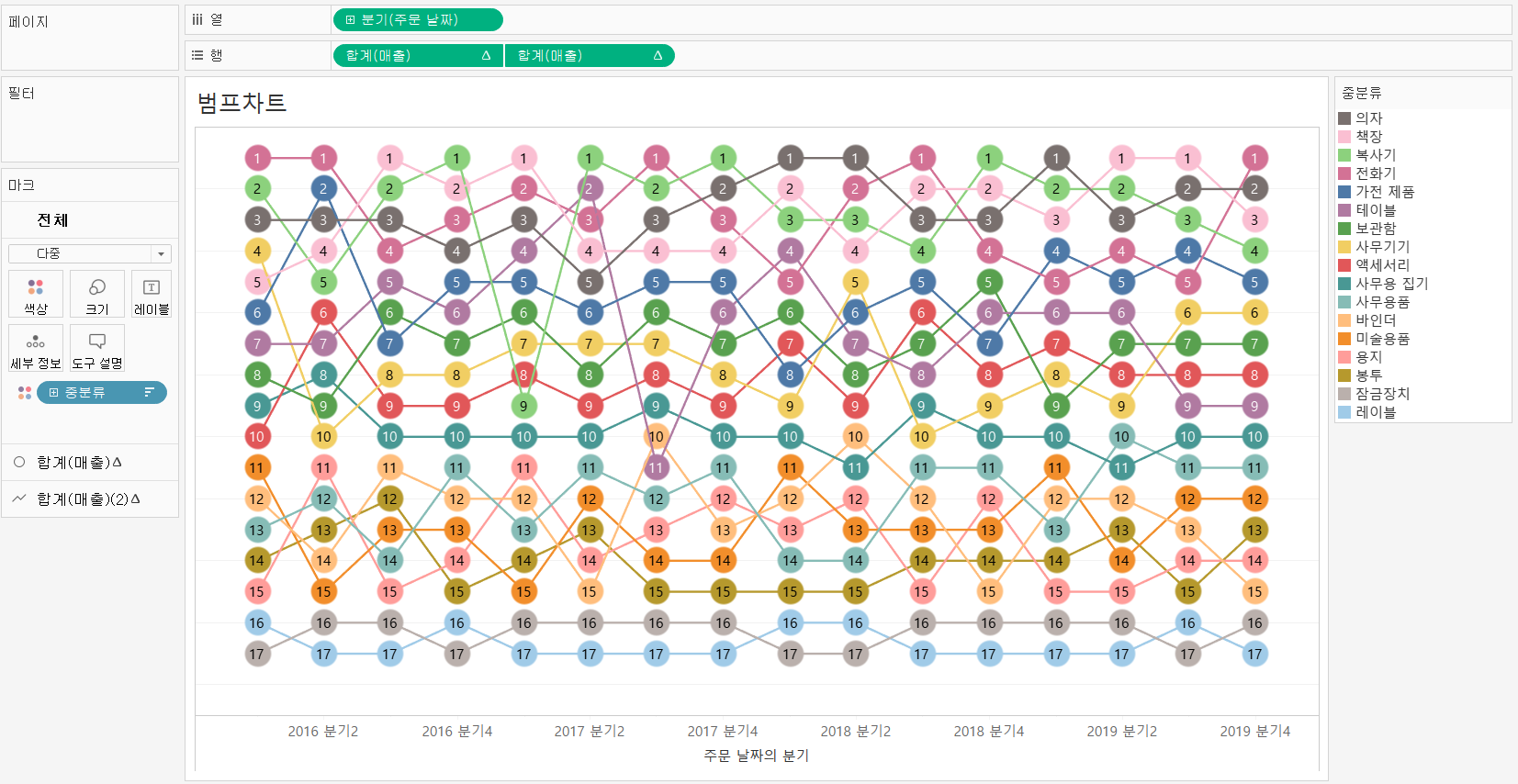 범프 차트는 시간에 따른 “순위” 변동을 나타낼 때 효과적인 차트