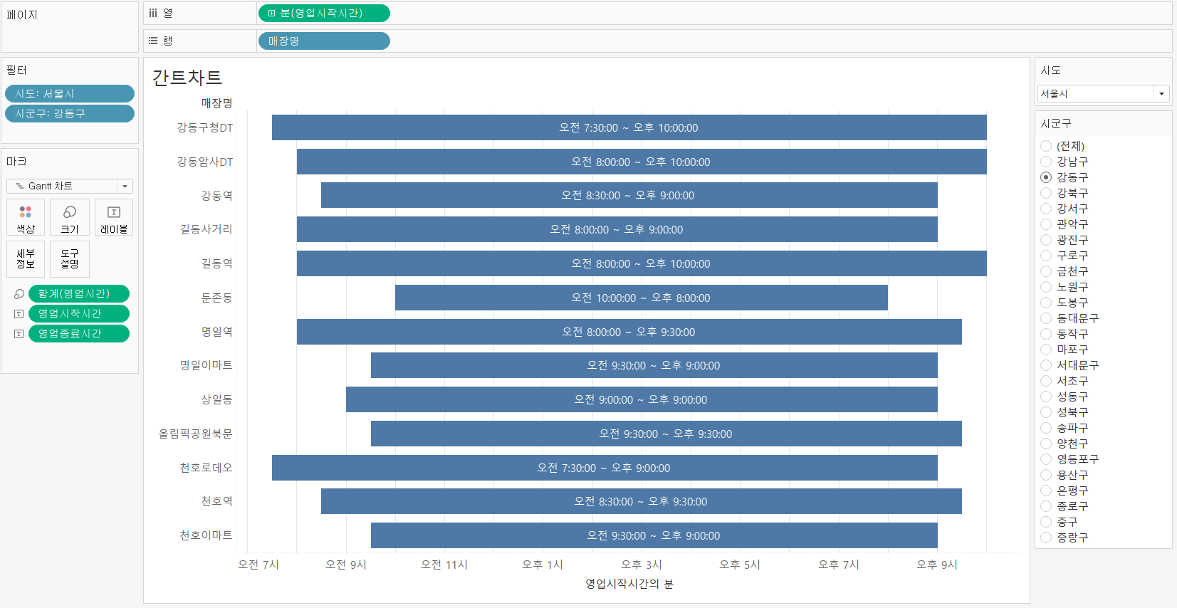 매장 별 오픈 시간과 마감 시간, 영업시간을 한 눈에 살펴보는 시각화