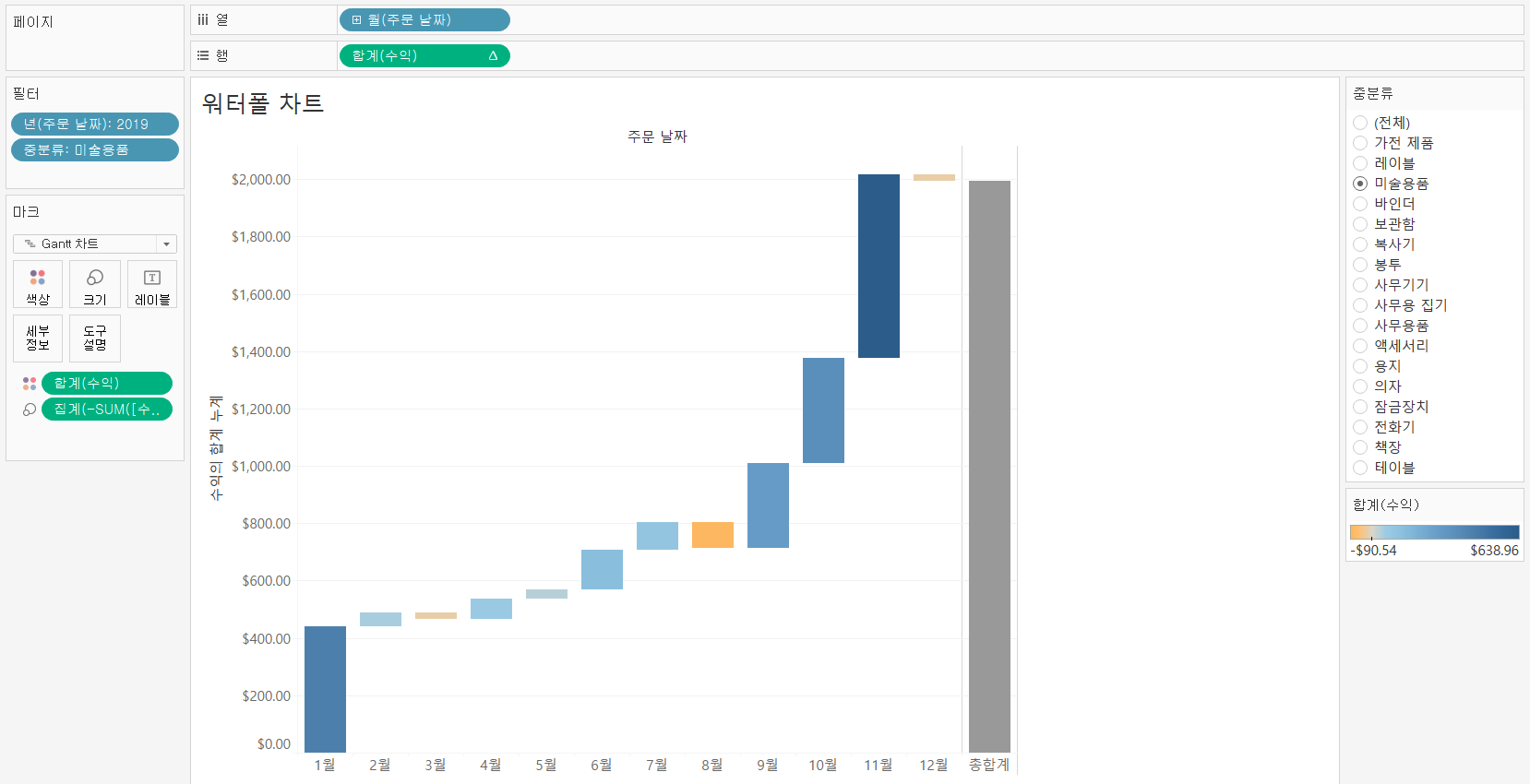 워터폴 차트 형태로 나타내는 월 별 수익