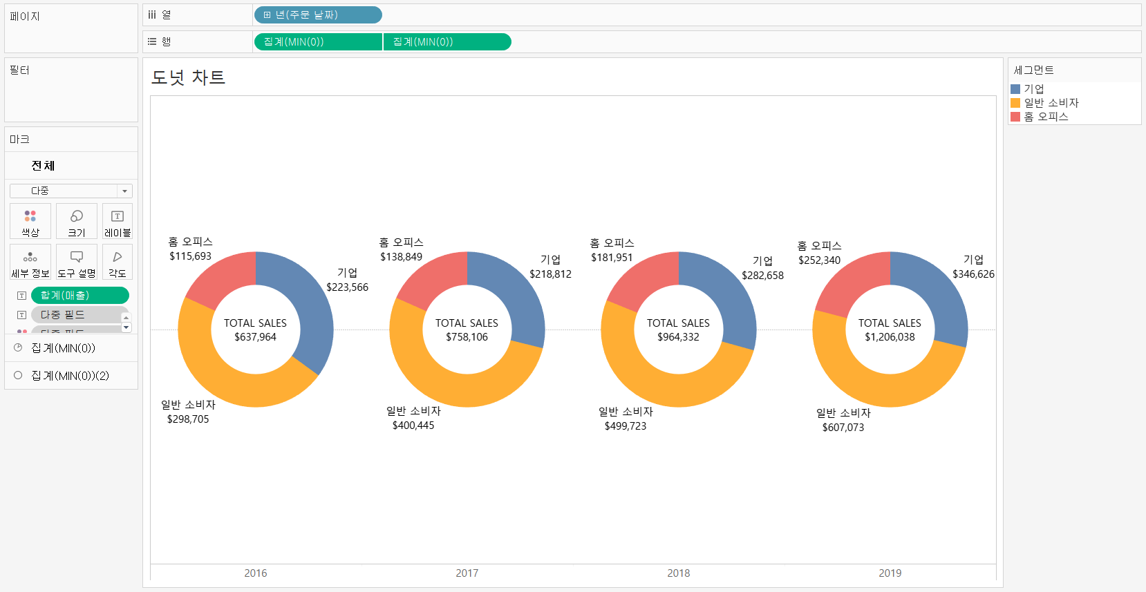 2016년부터 2019년까지 연도 별로 슈퍼스토어의 고객세그먼트 별 매출 비중이 어떻게 바뀌었을까?
