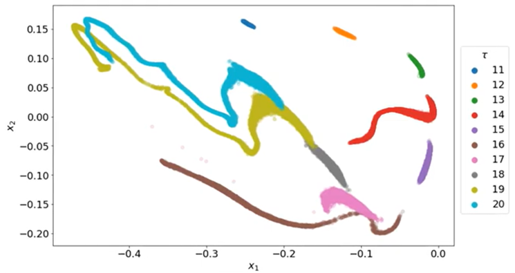 -TCN-AE 모델 학습: 다양한 시간 지연 parameter τ로 MG 시계열 사용