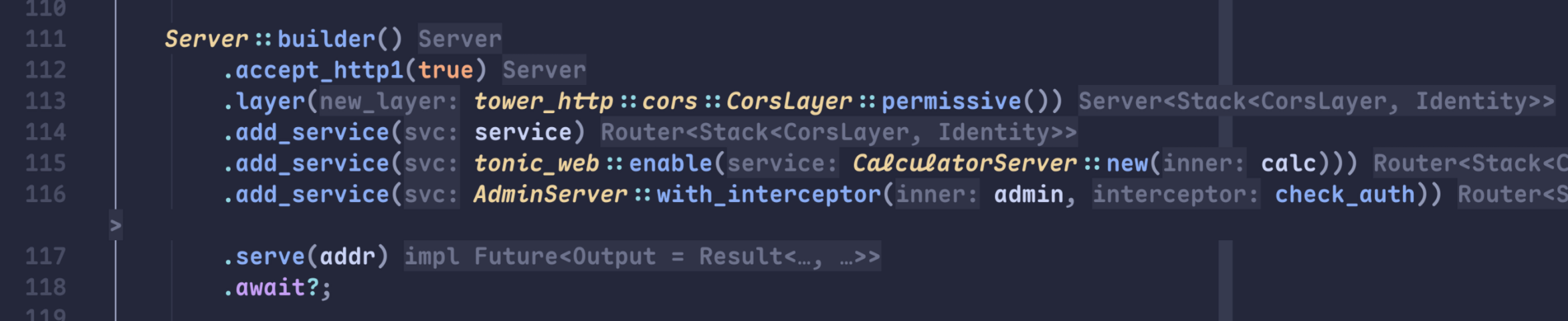 이 생성된 서버를 add_service 함수를 통해 등록해주면, grpc 서버로서 Calculator 서비스를 서빙하게 된다.