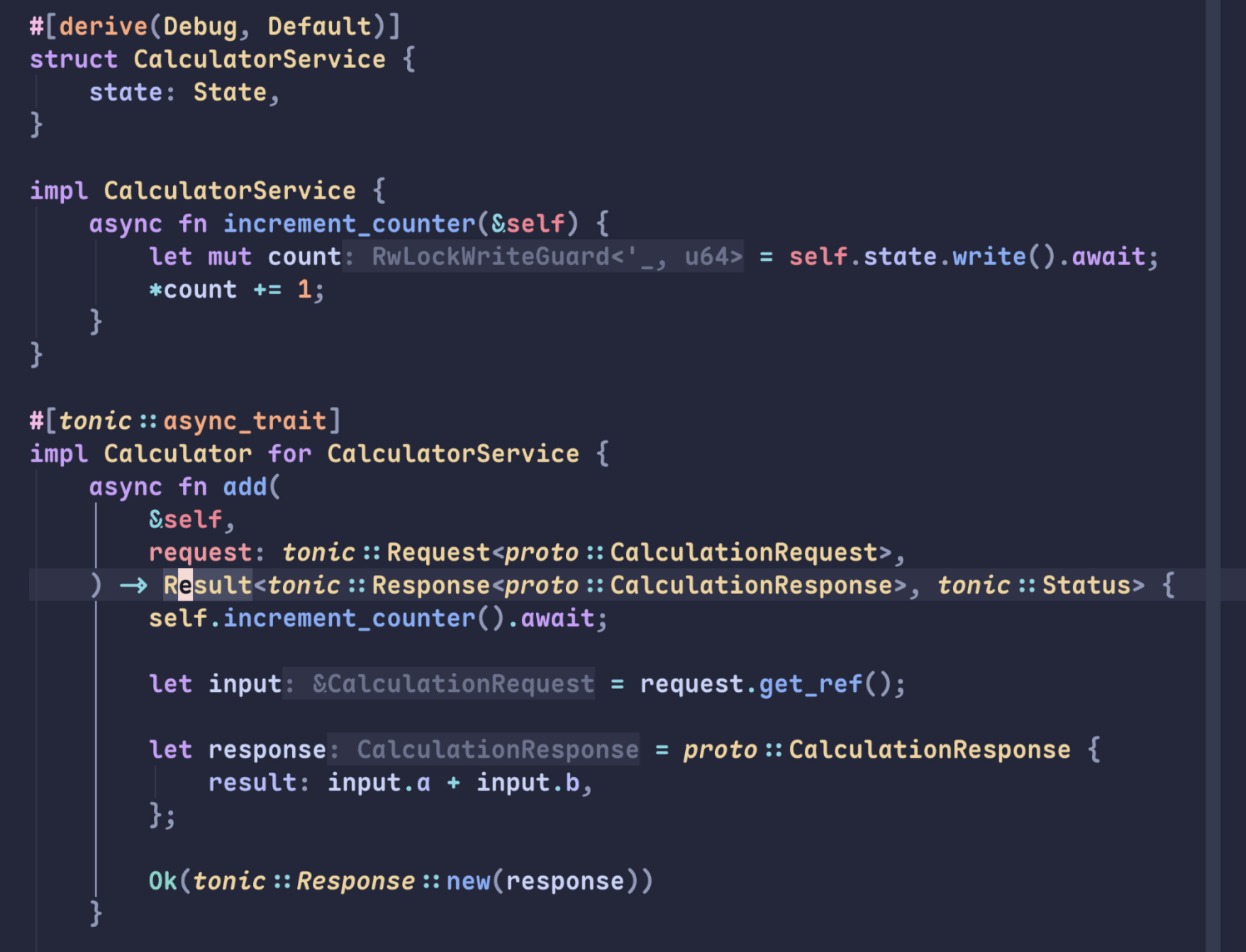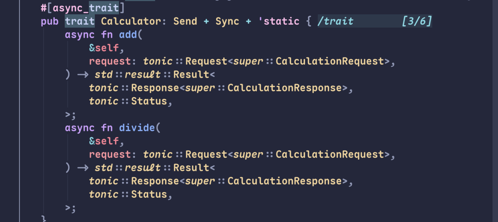 자동으로 생성된 calculator.rs 를 보면 proto 파일에 정의된 형태의 trait가 만들어진 것을 볼 수 있다. 위 trait를 구현한 어떤 서비스를 만들면 Calculator server에 등록할 수 있다.