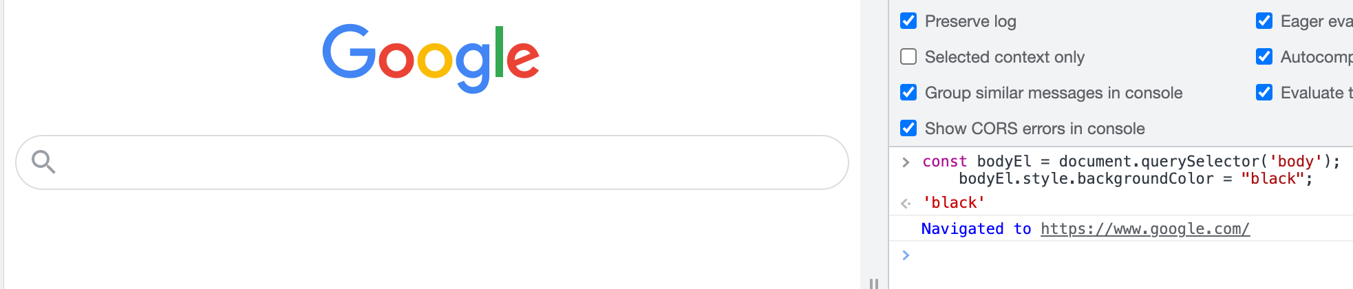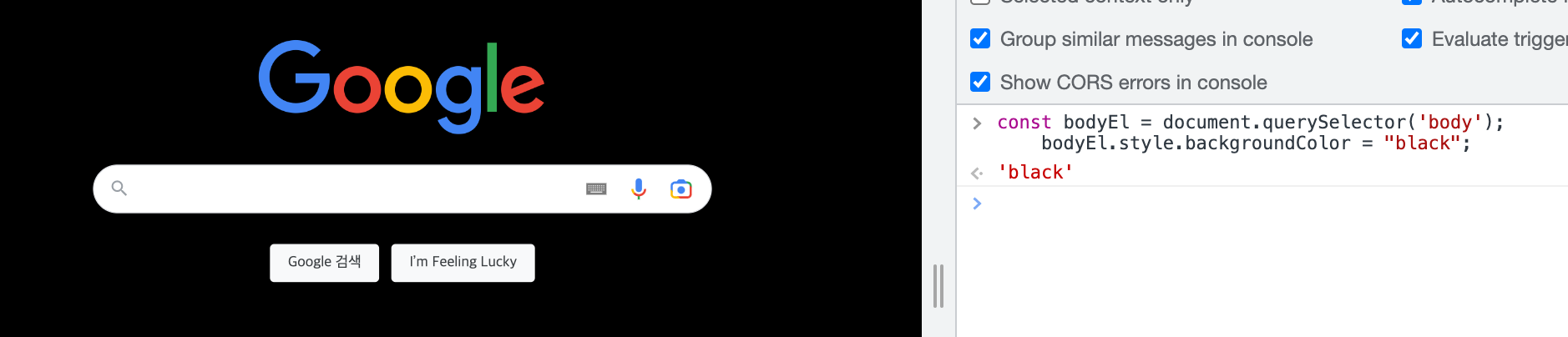 bodyEl.style.backgroundColor = "black";console 내용이 지워지지 않고 남게 하는 방법console 옆 설정에서 (⚙️버튼)을 누른뒤, "Preserve log" 체크