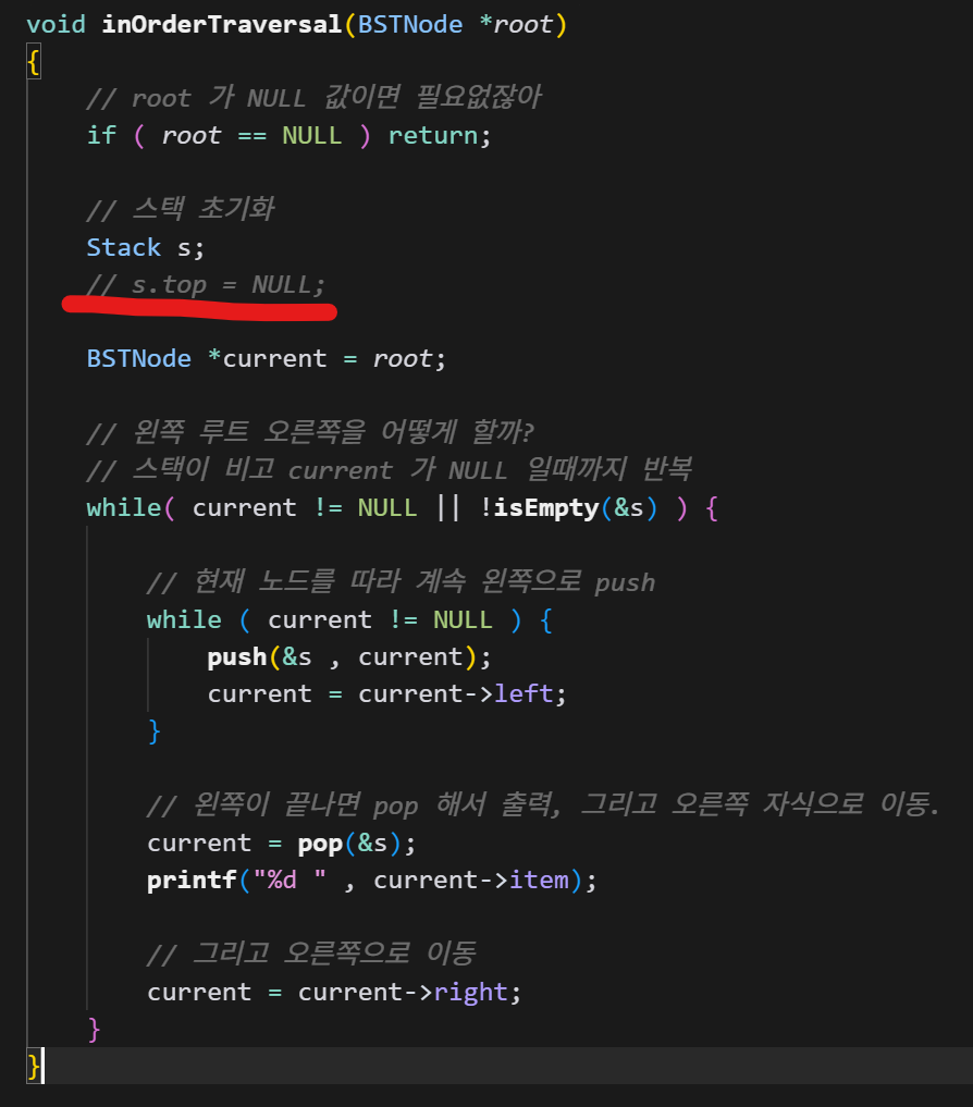 이 코드는 제가 트리의 중위순회를 해결한 코드지만, s.top 의 값을 주석처리 해주는 부분을 초기화해서 제대로 작동하지 않아요.