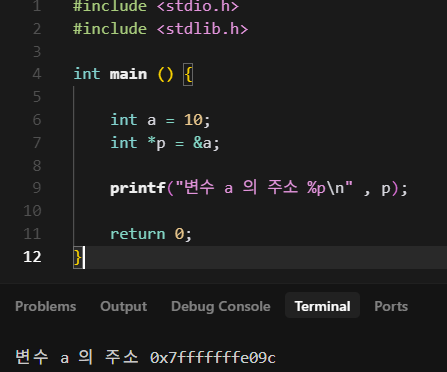 그리고 포인터 변수 p를 출력하면 , a의 주소가 정상적으로 출력되는 것을 확인할 수 있습니다.