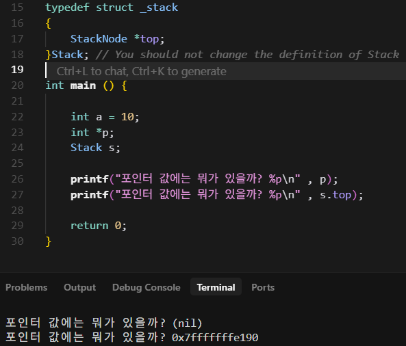 int* p와 우리가 과제를 해결하면서 사용했던 Stack의 top값을 출력해 보았습니다.
