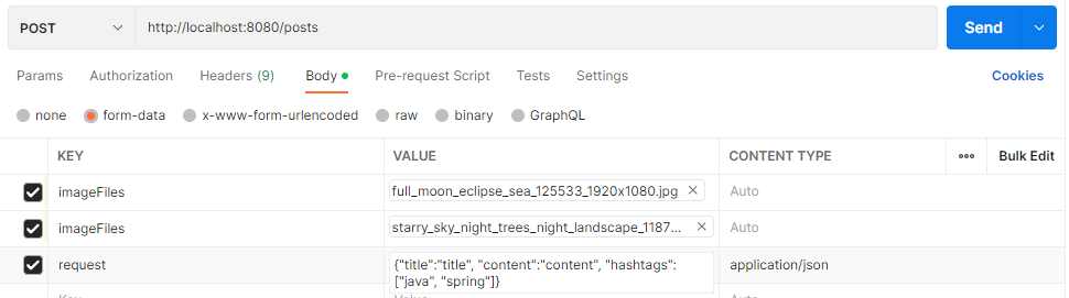 MultipartFile을 보내기 위해 form 형식으로 데이터를 전송한다. 이미지를 여러장 보내기 위해서는 컨트롤러 메서드에 설정해둔 변수명으로 여러개를 보내면 된다. 그리고 본문 dto 데이터는 content type으로 application/json을 명시해 주어야 한다.