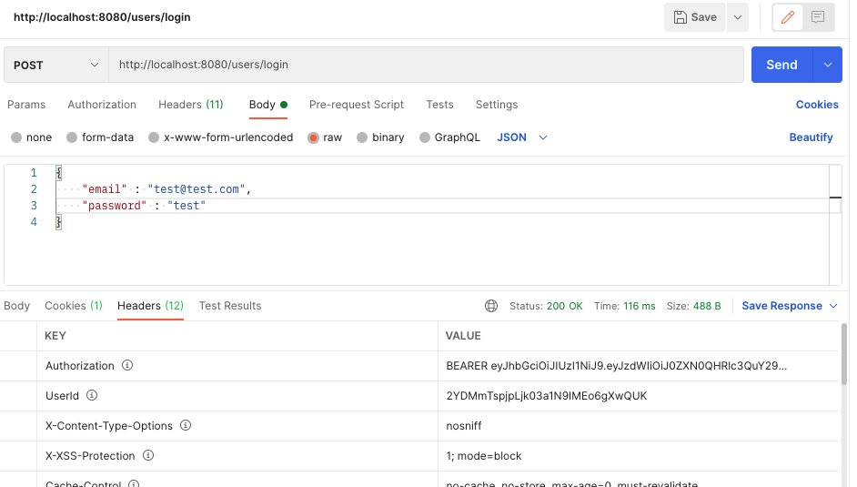 200 OK Status Code와 함께 Authorization에 jwt가 담겨서 오고, UserID도 오는 것을 볼 수 있다!