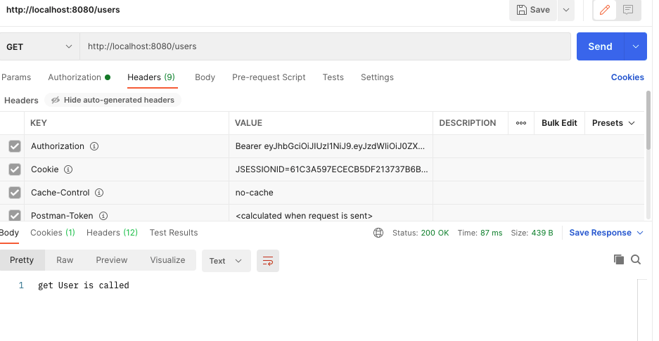 그리고 POSTMAN으로 먼저 users/login으로 로그인해서 얻은 토큰을 가지고 http://localhost:8080/users에 헤더로 Authorization에 Bearer 토큰으로 설정하고 get요청을 보내면 전에 컨트롤러에 정의해 주었던 get User is called 메세지가 나타난다!