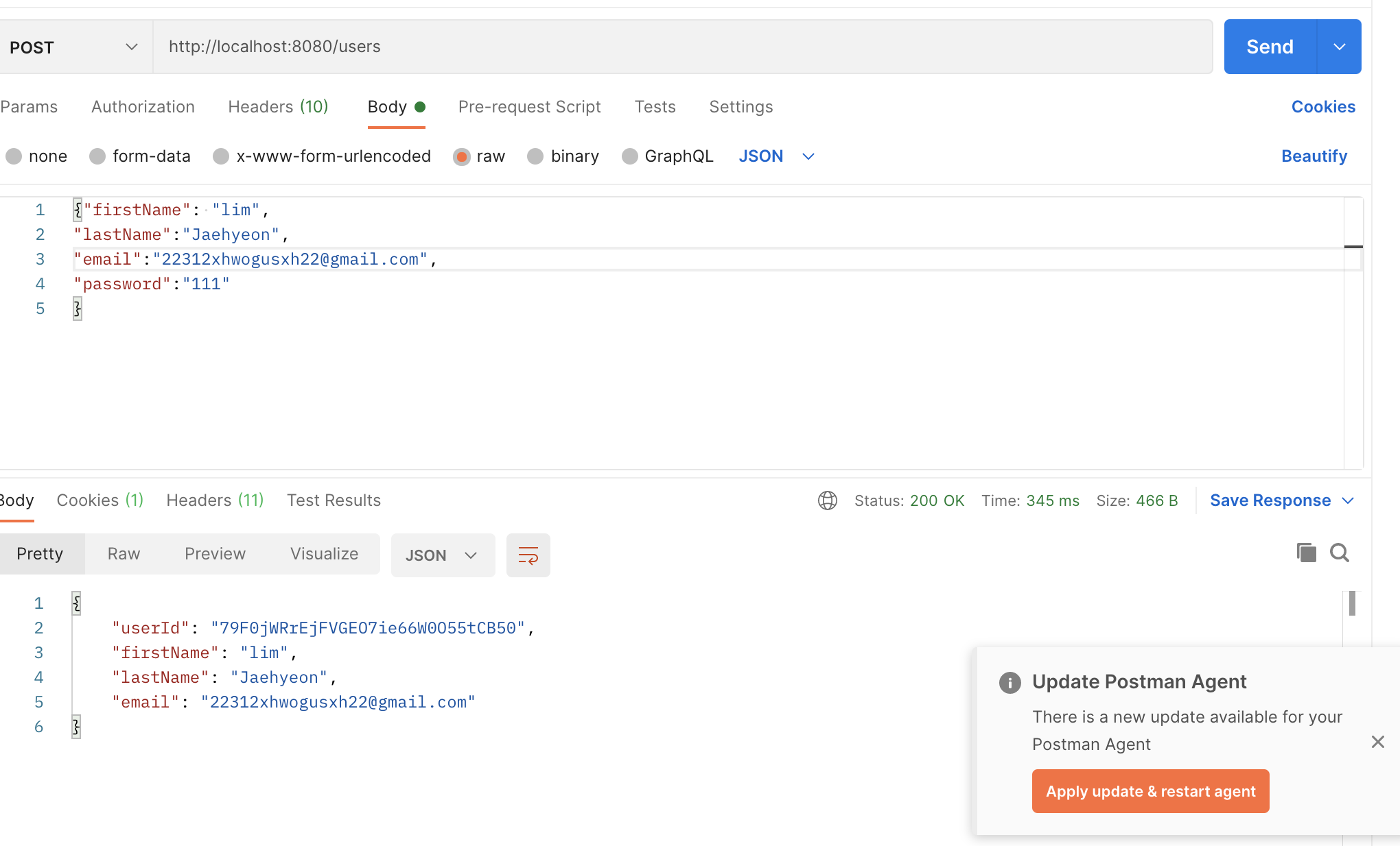 전까지는 401 Unauthorized였는데 이제 제대로 된 reponse가 온다! request도 잘되었고, response도 잘 왔다! 물론 아이디가 중복되게 보내면 회원가입이 안됬다는 에러메세지가 response된다!