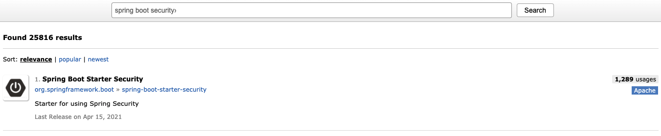Maven Repository에서 Spring Boot Security를 검색하면 다음과 같이 나온다.
