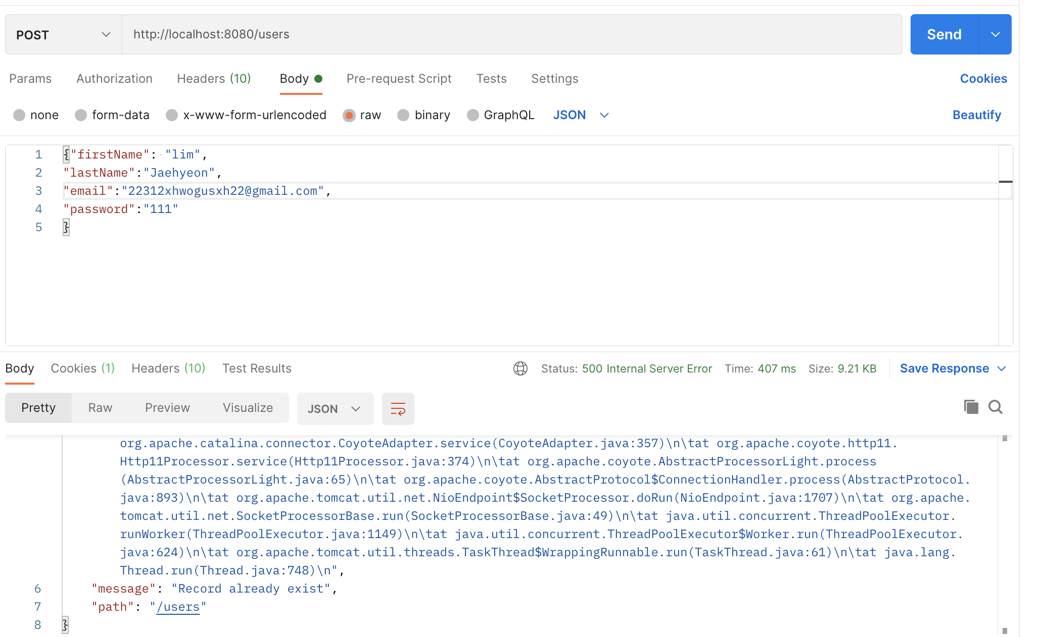 if(userRepository.findByEmail(user.getEmail()) != null) throw new RuntimeException("Record already exist");