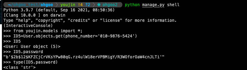python shell에서 DB에 저장된 ID = 5 유저의 패스워드 type