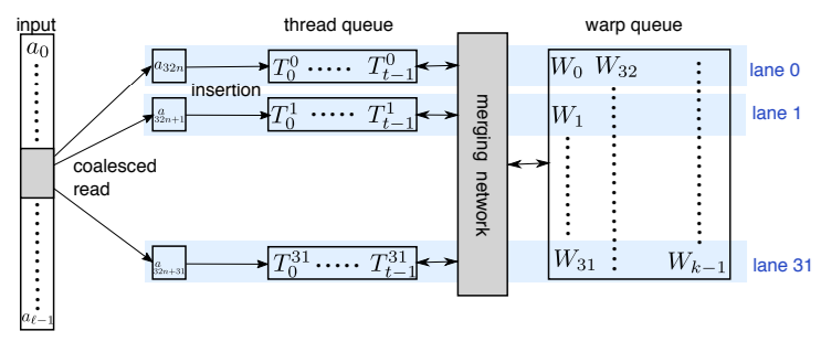 WarpSelect는 k-선택을 위해 레지스터 내에서 연산을 수행하며, 한 번만 데이터 순회하고, 워프 간 동기화를 피함