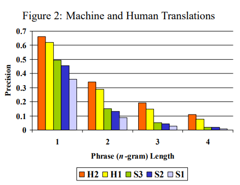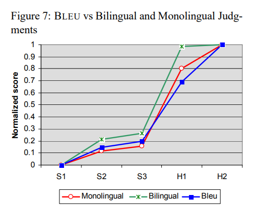 S3와 H1(인간 번역자 1)의 큰 차이도 BLEU가 정확하게 평가하고 있음