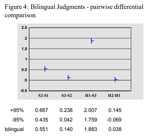 이중언어 그룹도 S3가 S2보다 약간 더 나은 번역을 제공한다고 판단했으며, 이 차이는 95% 신뢰 수준에서 유의미함