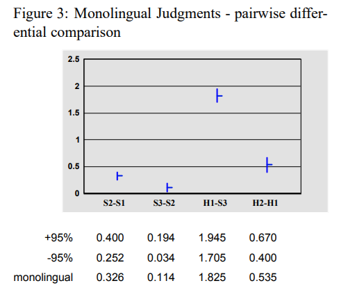 하지만 이중언어 그룹은 인간 번역자들의 결과(H1과 H2)를 거의 동일하게 평가했으며, 95% 신뢰 수준에서 유의미한 차이를 보이지 않음