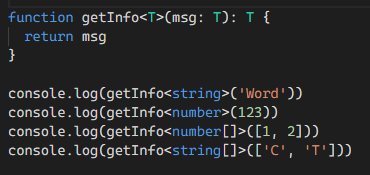 function 함수명<타입 변수 지정>(msg: 타입 인자): 타입 반환 {}