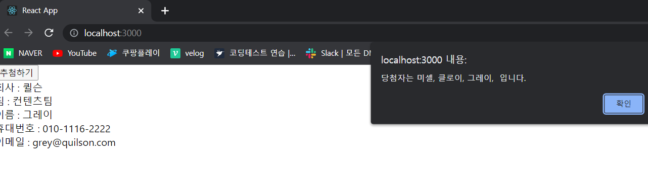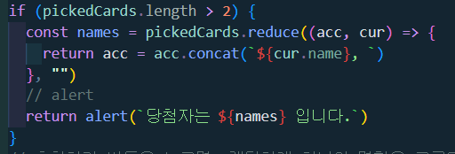 추첨하기 button을 만들어주고 클릭하면 draw 함수를 실행한다.