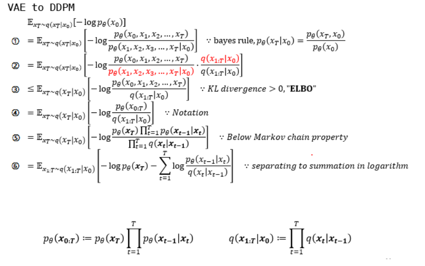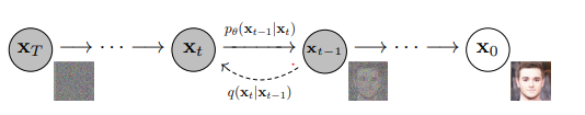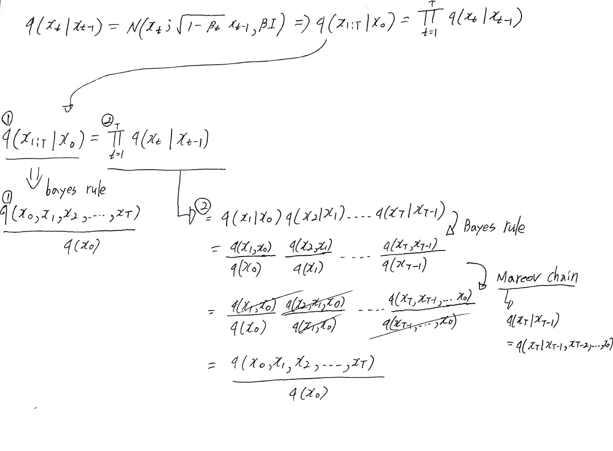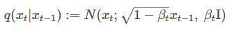 이때, 더해지는 noise는 미리 정해둔 variance schedule 를 사용하는데 이를 통해 가우시안 노이즈를 더해가는 프로세스를 q로 정의