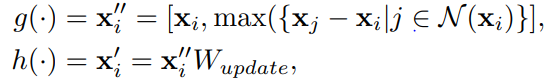 즉, 해당 노드와 주변 노드의 표현 간의 차이중 최댓값을 찾아 이웃 노드들의 표현과 현재 노드의 표현 간의 차이를 최대화함으로써 그래프 내에서 xi의 중요성을 강조하고, 주변 노드들의 정보를 고려하여 xj의 표현을 업데이트합니다.