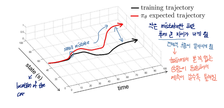 실수하면 다음 상황들이 train distribution과 달라지기 때문