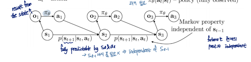 - πθ(at∣st) : policy (fully observed)